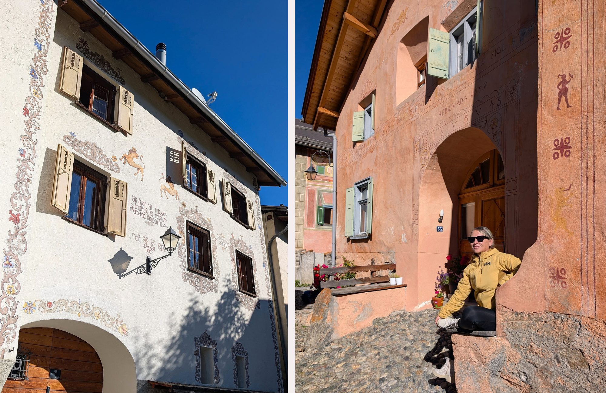 Nun beginnt der rauere und ursprünglichere Teil des Engadins auf dem Weg Richtung Guarda und Ftan. Beide Dörfer liegen erhöht über dem Inntal, wodurch die Anstiege mit dem Rad etwas anspruchsvoller werden. Dafür eröffnen sich eindrucksvolle Ausblicke auf wilde Flusslandschaften und die umliegenden Gipfel. Guarda gilt als eines der am besten erhaltenen Engadiner Dörfer mit typischen Häusern, kunstvollen Sgraffito-Verzierungen und engen Gassen – viele davon stammen aus dem 16. und 17. Jahrhundert. Die filigranen Ornamente erzählen vom bäuerlichen Leben, vom Glauben und von jahrhundertealter Handwerkskunst. Charakteristisch sind zudem die dicken Mauern, kleinen Fenster und hölzernen Balkone.