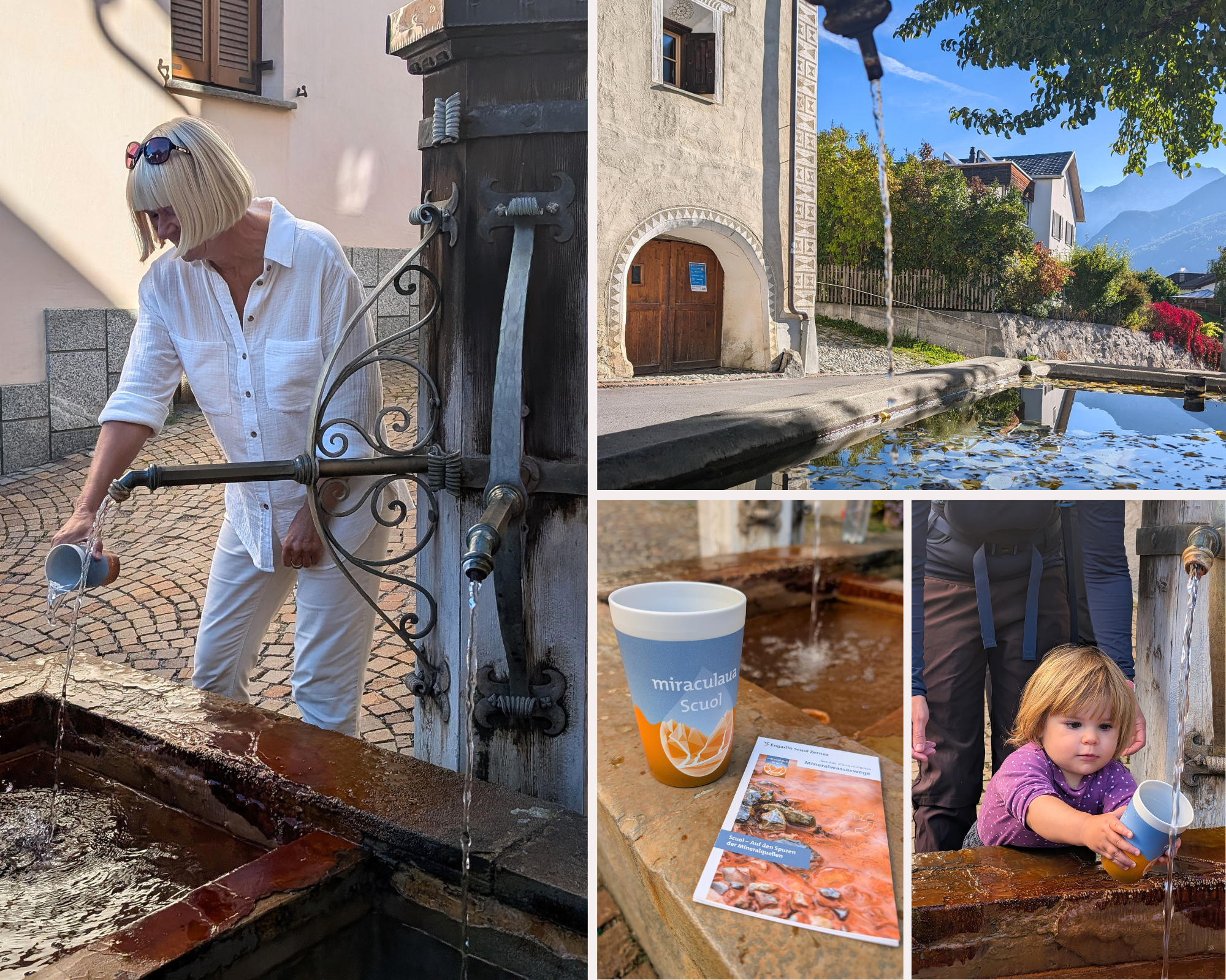 Die gemeinsame Wanderung wird durch mehrere Mineralwasser-Degustationen ergänzt. Dabei werden die Unterschiede der einzelnen Quellen in Geschmack, Textur und Mineralisierung bewusst erfahrbar gemacht. Einige Verkostungen finden an Brunnen im Dorfkern statt, andere an ursprünglichen Quellen in der Nähe von Felswänden außerhalb des Ortes. Im Gespräch mit Sabina wird deutlich, dass in Scuol über 20 natürliche Mineralquellen entspringen, von denen viele reich an Magnesium, Kalzium und Eisen sind.