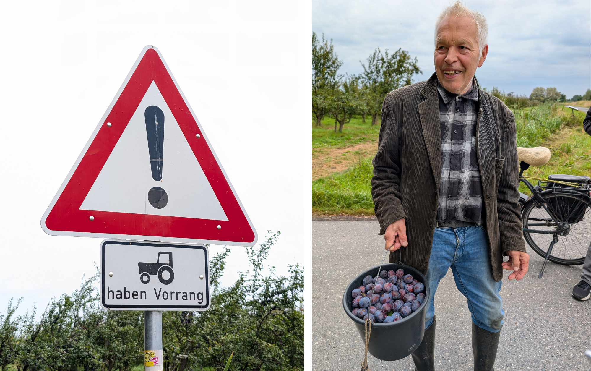 Über die Obstroute geht es von Stade in die sattgrüne Natur des Alten Landes. Die gut ausgeschilderten Wege führen uns durch ein riesiges Meer von Obstbäumen – alle randvoll gefüllt und zum Greifen nah. Aus verschiedenen Quellen erfahren wir, dass das Jahr 2025 ein gutes Obsterntejahr werden soll. Bei einer kurzen Pause treffen wir einen Bauern bei der Pflaumenernte. Auch er kann nur ein sehr gutes Erntejahr bestätigen und bietet uns eine Kostprobe seiner frisch gepflückten Früchte an.