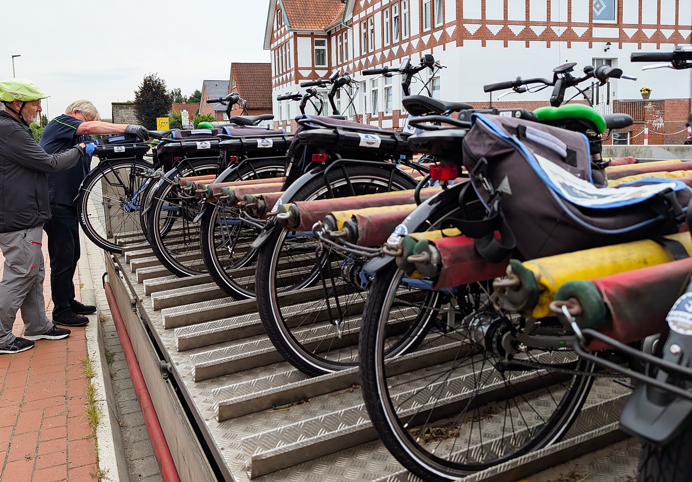 Eine Tagestour im Alten Land lässt sich sehr individuell und flexibel gestalten. Denn im Angebot stehen neben dem Radfahren und Wandern weitere Möglichkeiten zum Beispiel die Fahrt mit den Fähren sowie verschiedene Bus- und Bahnlinien. Eine etwas unbekanntere aber sehr praktische Alternative bietet seit 2005 der Elbe-Radwanderbus. Dabei ist an einem Bus ein angehängter Niederflur-Fahrradanhänger angebracht, der Platz für 15 Fahrräder (auch E-Bikes) bietet. Aktuell gibt es zwei Linien, die hauptsächlich an den Wochenenden und Feiertagen sowie von Mai bis Oktober verkehren. Der Busfahrer hilft beim Verladen der Räder (siehe Foto oben). Ein großer Vorteil des Elbe-Radwanderbusses ist es, Abschnitte per Rad und Teilstrecken per Bus zu unternehmen (z. B. für den Rückweg oder bei ungünstigem Wetterwechsel). Betrieben wird er als Gemeinschaftsprojekt vom Tourismusverband Landkreis Stade / Elbe e.V., Landkreis Stade sowie den Verkehrsgesellschaften KVG Stade und Verkehrsgesellschaft Nord-Ost-Niedersachsen (VNO).